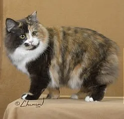 “Miss A” is a tortoiseshell and white, long hair, rumpy, female Manx. As a kitten, Miss A strutted around like the world was her pearl and she was Miss America herself. As time went by the name stuck and she tries her best to live up to it. After a break from showing, she’s once again gracing the show halls with her presence. At her first show out she placed in 3 out of the six rings. In 2011 she became a Grand Champion! Miss America went to Rainbow Bridge, Summer of 2025. She lived to be 18yrs old and is missed.